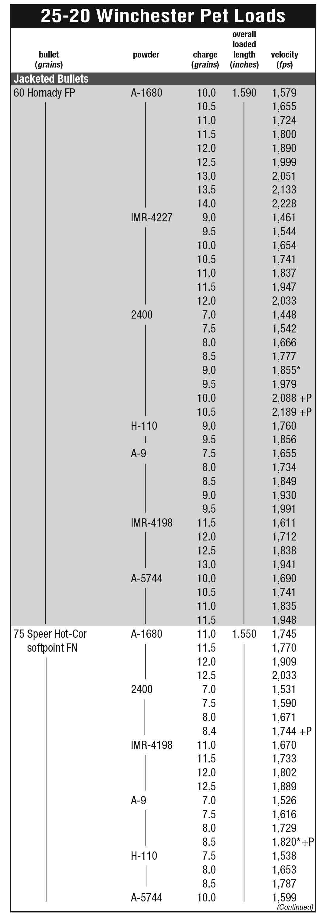The accompanying Pet Loads data was generally held to 28,000 CUP, but there are a few loads listed that modestly exceed that figure and can generate up to 32,000 CUP. These loads are marked as +P and are only recommended for modern guns, such as the Marlin Model 1894CL Classic used herein. Critics of the above pressure levels might point out that the 25-20’s case should not be loaded to that figure. It is true that the case is thin; however, when Winchester developed the 218 Bee in 1938, it was based on the 25-20 case and was loaded with pressures of 40,000 CUP. Granted, within a few years Winchester recognized the need to slightly strengthen the Bee case, but the 25-20 case will readily handle 32,000 CUP loads in modern rifles. It should be noted, however, that case life will be shortened –the same as any other case when loaded with higher pressures.