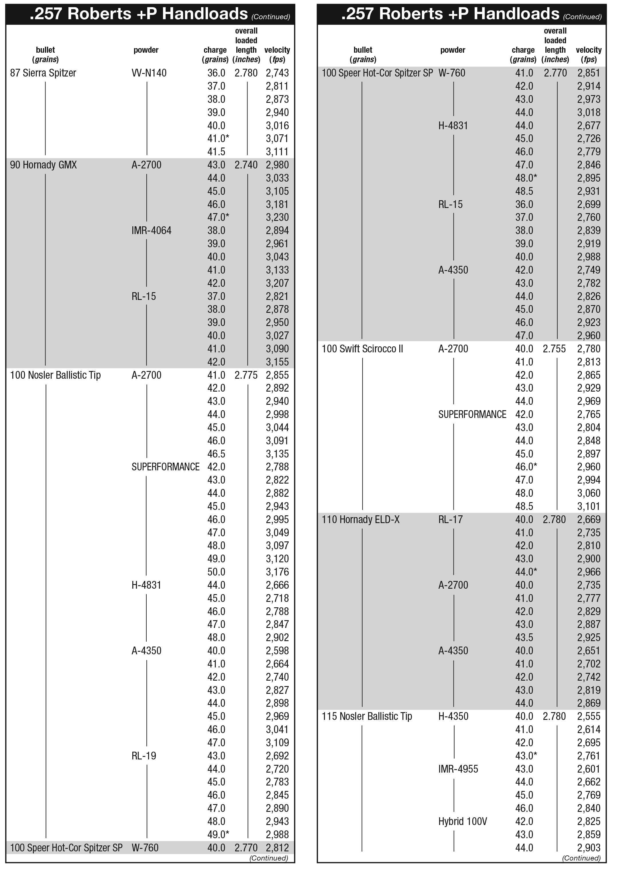 The .257 Roberts has (finally) been updated to piezoelectric pressure measurements, with standard pressure loads listed at 54,000 psi while +P loads are listed at 58,000 psi. The maximum loads in the accompanying data are almost all +P pressures. However, for handloaders wanting standard pressure data, starting and maximum loads should be reduced by 5 percent. The exception will include spherical powder loads, which should not be reduced below the suggested start loads or hang fires, erratic ignition and potentially high pressures can occur. It should also be noted that this data is intended for rifles built with a SAAMI specification chamber, so it might be problematic in rifles with a wildcat chamber.