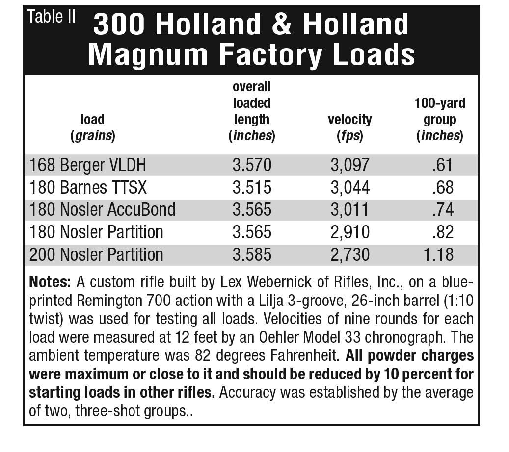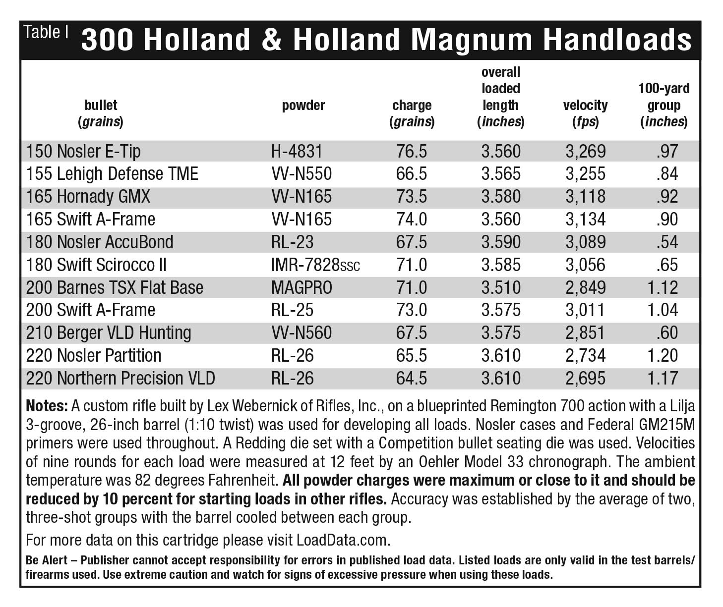 The first rifle in 300 H&H that I owned was on a modified 1917 Enfield action, and while I would like to say it was built by Griffin & Howe and it center-punched tacks, its builder was unknown, and it was not very accurate. Next was a Model 70 that I hunted with for several years before giving it to a friend. It was one of the first factory rifles I owned that would consistently shoot three bullets inside an inch at 100 yards. As a bonus, it digested, without a single whimper, the maximum charge of H-4831 shown on page 159 of the Hodgdon’s Data Manual Number 23. Maximum velocity clocked by Hodgdon’s 24-inch test barrel was 3,013 fps, and the same charge behind the Nosler 180-grain Partition was 87 fps faster in my rifle, probably due to its longer 26-inch barrel. Winchester cases were long-lived, seldom needed trimming, and I don’t recall discarding a single one due to an expanded primer pocket.