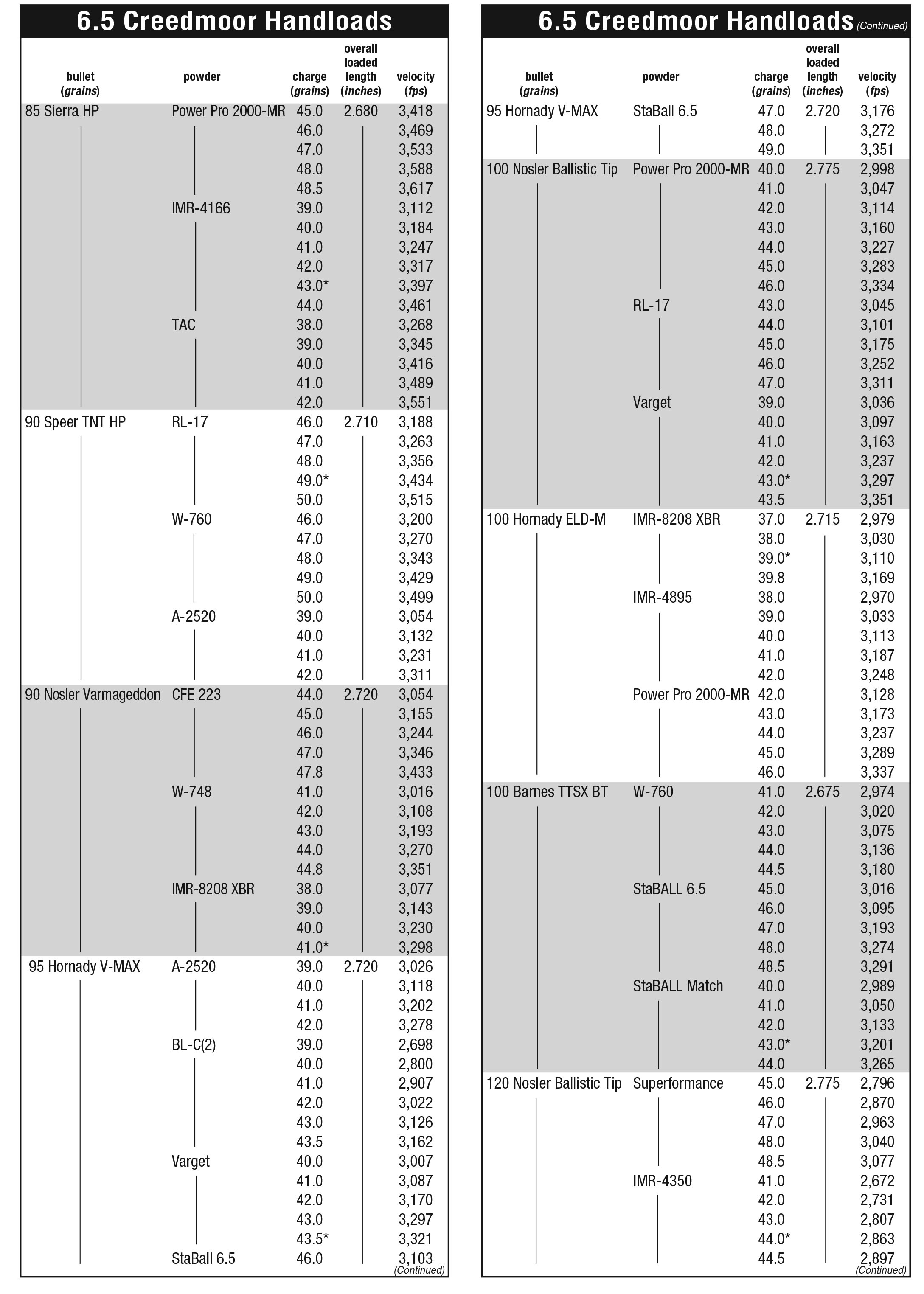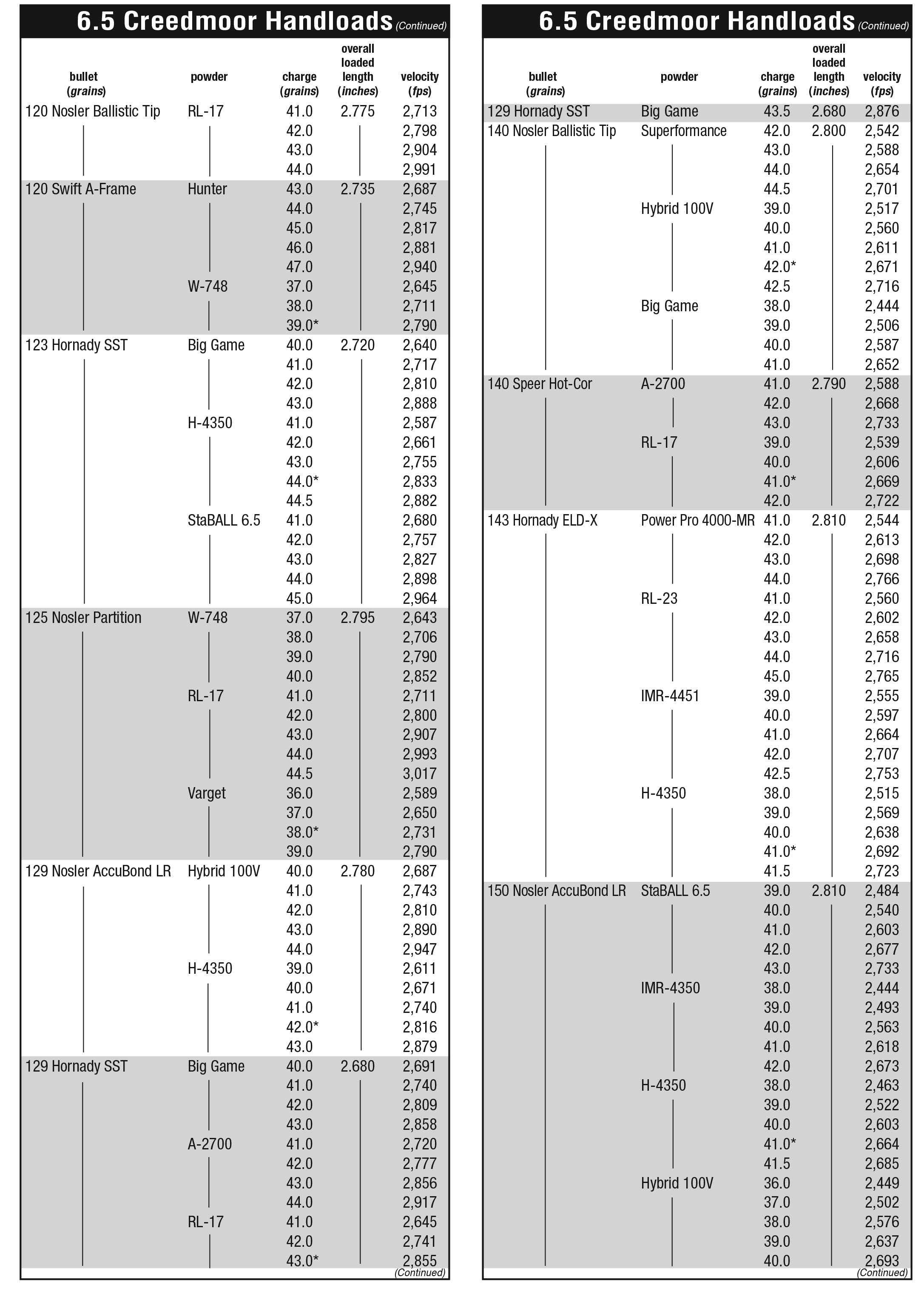 Winchester W-760, StaBALL 6.5, StaBALL Match, Hodgdon Varget and IMR-4895. For 120- through 147-grain weight bullets Hodgdon Superformance, H-4350, Varget, Hybrid 100V, Winchester StaBALL 6.5, W-760, IMR-4451, IMR-4350, Reloder 17, Reloder 19, Reloder 23, Power Pro 4000-MR, Accurate 2700, A-4350, Ramshot Hunter and Big Game each provided good general results.