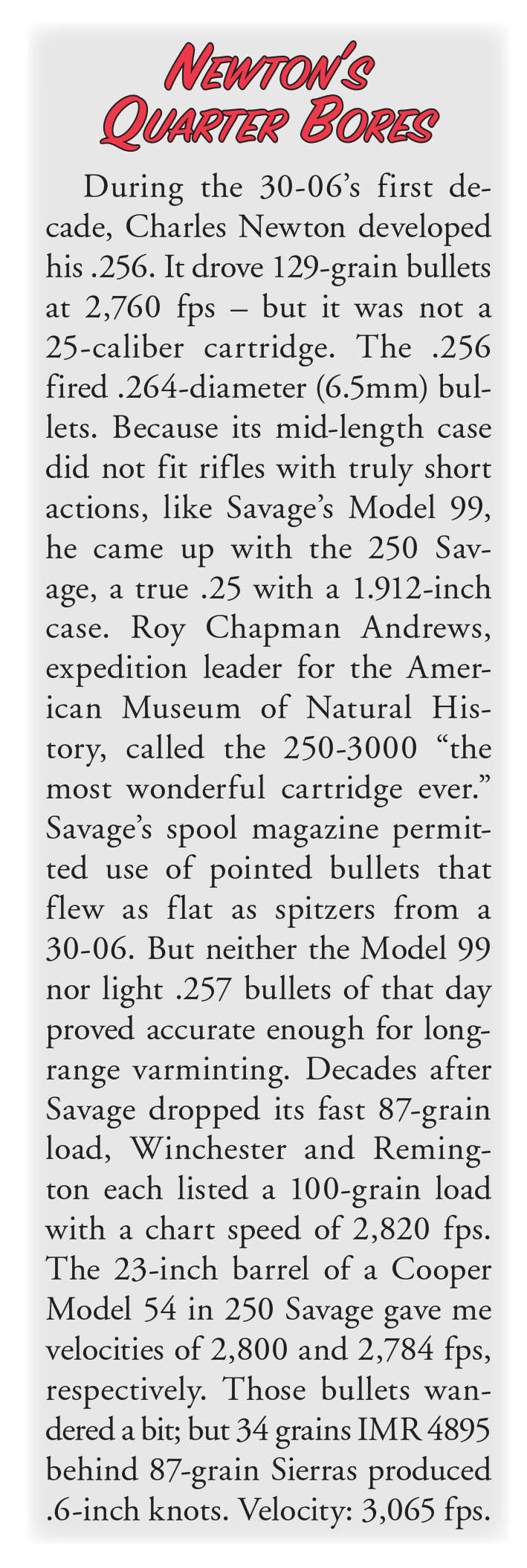 At a glance, I expected spunky loads in the 25 Krag to match the enthusiasm of the .250 developed around 1913 by the brilliant Charles Newton. Savage stoked that cartridge to send 87-grain bullets from its Model 99 lever rifle at 3,000 feet per second (fps), blinding speed in those days. Newton was evidently willing to forego the Madison Avenue moniker of 250-3000 to launch 100-grain bullets at 2,800 fps. Eventually, the 87-grain load was dropped; the cartridge endures as the 250 Savage. Handloads in bolt rifles can improve markedly on the velocity and accuracy of 250 factory loads.