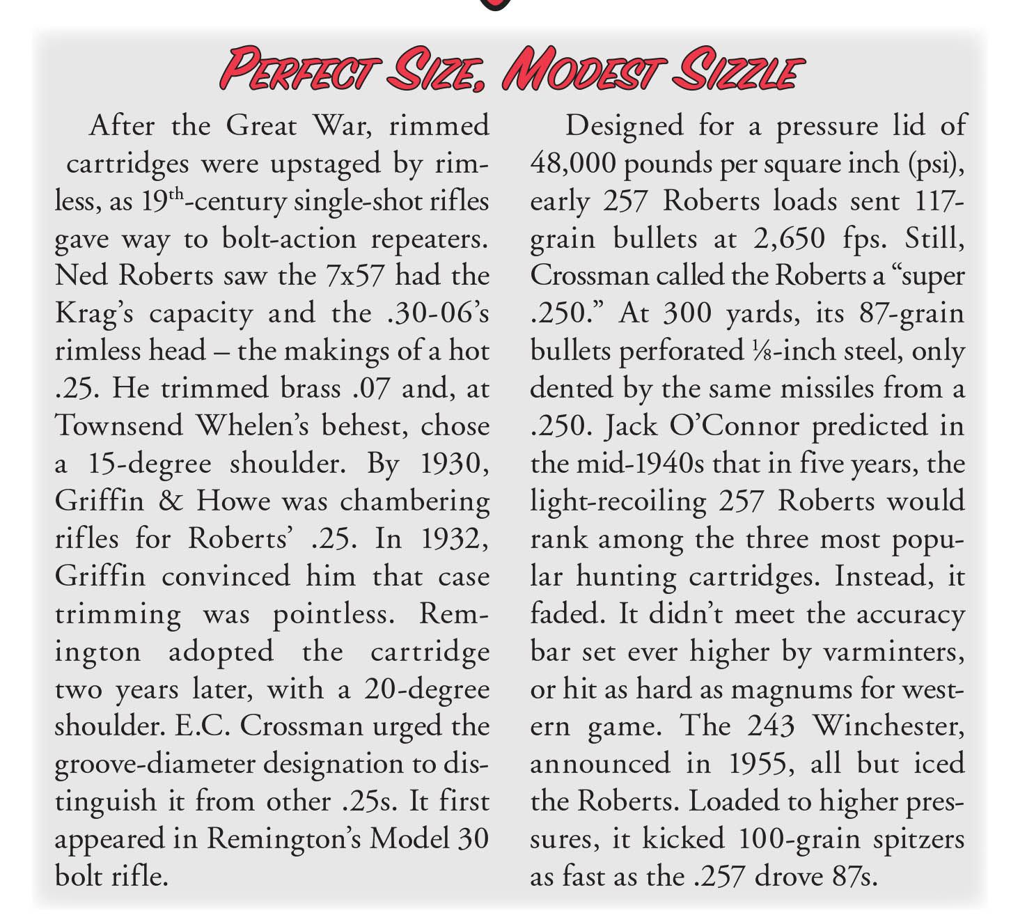 In repeating rifles, the Roberts is still imperfect. It derives from the 7x57, a fine option in the Mauser 1898 actions for which it was designed. It’s a mid-length cartridge, an odd fit in the long and short actions of modern sporters fashioned, respectively, for the 30-06 and 308 Winchester and kin. Long actions wonder why they’ve not been fed the frothier 25-06; short magazines refuse the Roberts unless bullets are seated quite deep.