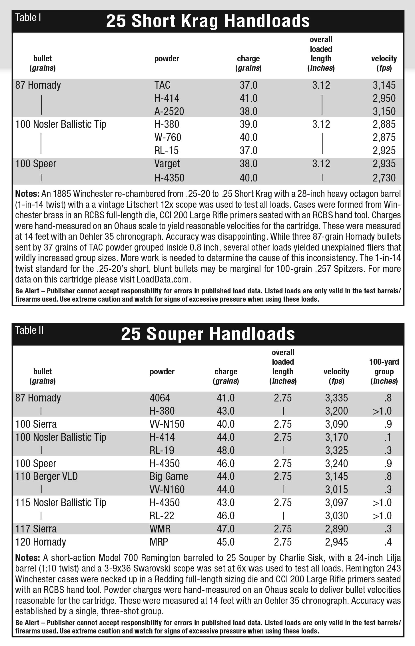 Using powders as slow as IMR-4350 in the 25 Krag, I found 87- and 100-grain bullets preferred faster fuel (Table 1). Easily overtaking the 250 Savage with powders in the IMR-4895 W-760 burn range, this wildcat eclipses even modern 257 Roberts +P loads. Predictably, it falls well shy of catching the 25-06, a Remington cartridge since 1969. (As early as 1909, Charles Newton experimented with .25s on the 30-06 case. So did many other wildcatters. The 25-06 endured as a wildcat cartridge longer than it’s been commercially loaded!)