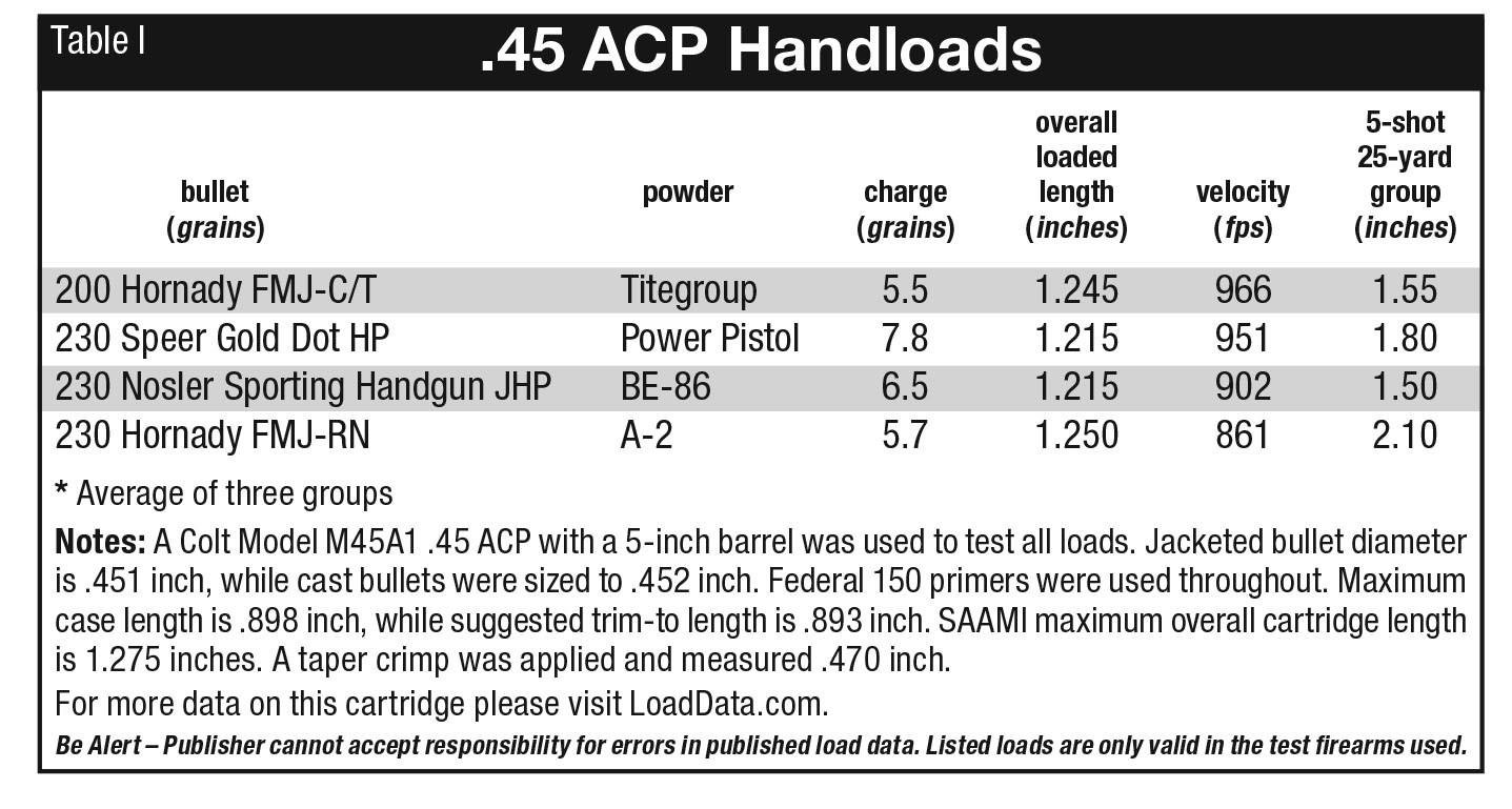 In addition to factory loads, the Colt M45A1 was tested with select handloads, that proved accurate and reliable.