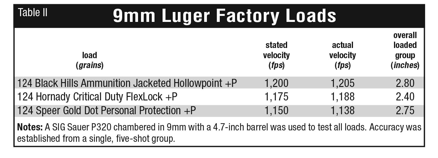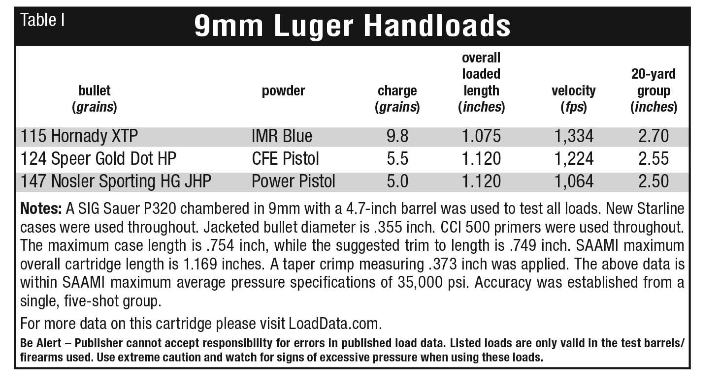 Moving on to handloads containing 115, 124 and 147-grain JHP bullets from Hornady, Speer and Nosler respectively, groups ran 2.50 to 2.70 inches (see Table 1 for details).