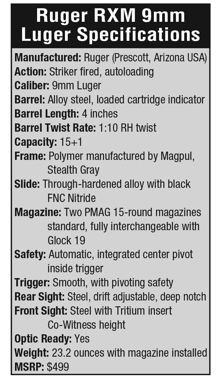 The RXM mechanics are more or less identical to the Glock 19, so it naturally accepts the same magazines and most accessories as Glock Gen 3 guns. The Ruger comes standard with two 15-round Magpul PMAG magazines.