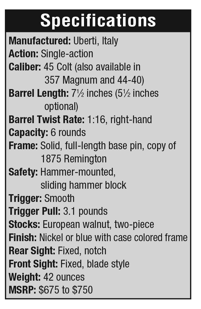 For more than half a century, Aldo Uberti has been offering a reproduction of the historic Remington Model 1875 Single Action Revolver (aka 1875 Army, Improved Army and Frontier Army). In addition to being a close copy manufactured with modern steels, this sixgun is handsome, shoots well and is a bargain considering its overall quality and cost.