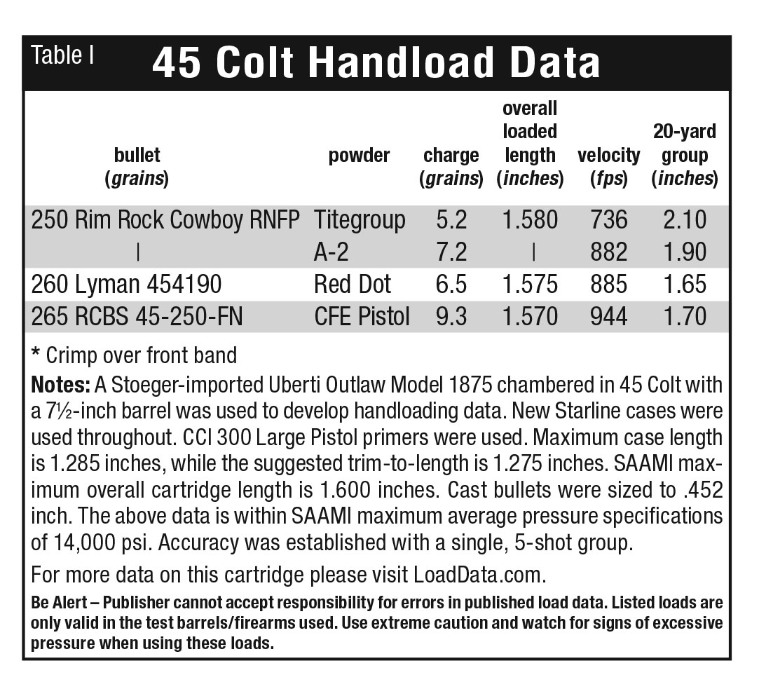 The Rim Rock 250-grain Cowboy bullet was pushed to 736 fps using 5.2 grains of Hodgdon Titegroup powder and grouped into 2.10 inches. Changing to 7.2 grains of Accurate No. 2 powder, velocity jumped to 882 fps, and groups dropped to 1.90 inches. The tightest group came from my hand-cast bullets from