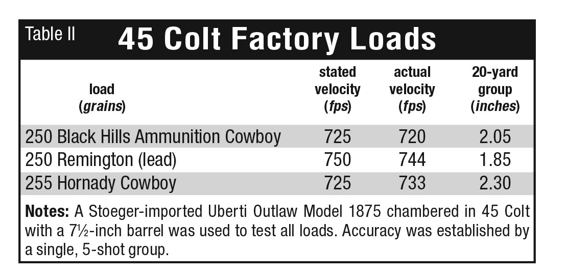 Three factory loads were tried from Black Hills Ammunition, Remington and Hornady. The Black Hills Cowboy 250-grain RNFP load at 720 feet per second (fps) managed to group into just over 2 inches at 20 yards. The Remington load has been changed over the last few years to push a 250-grain lead hollow-base bullet with conical profile and flat point at a listed 750 fps and clocked 744 fps, but for the past 125 years has been listed at 860 to 870 fps. This reduced load is due to the many old guns still in use that are from the black powder era. Regardless, that load is grouped into 1.85 inches. The Hornady Cowboy load pushed a 255-grain lead bullet to 733 fps and grouped into 2.30 inches. All loads grouped center, or very close to center, and were approximately 11⁄2 to 2 inches low. If desired, the front sight can be lowered to bring the point of impact to center.