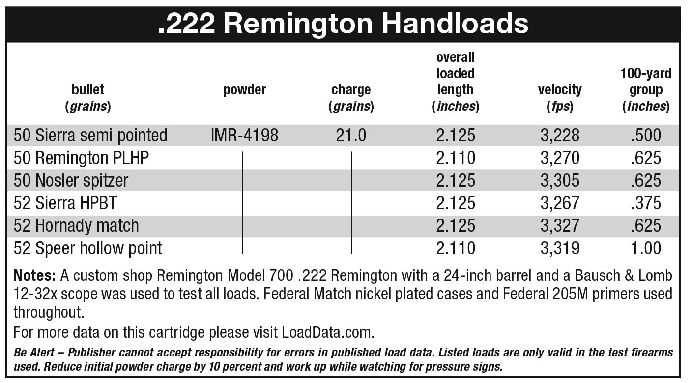 In reviewing my own experiences with the .222 Remington, all three of the 50-grain bullets from Sierra, Remington and Nosler came very close to each other in the accuracy department, in fact, to one-eighth of an inch apart. Velocity was very close and take note that I checked the weight of 10 each of the various bullets (for an average) just to show the close manufacturing tolerances we enjoy today. These 50-grain bullets averaged 50.1, 49.1 and 50.1 in weight right out of the box.