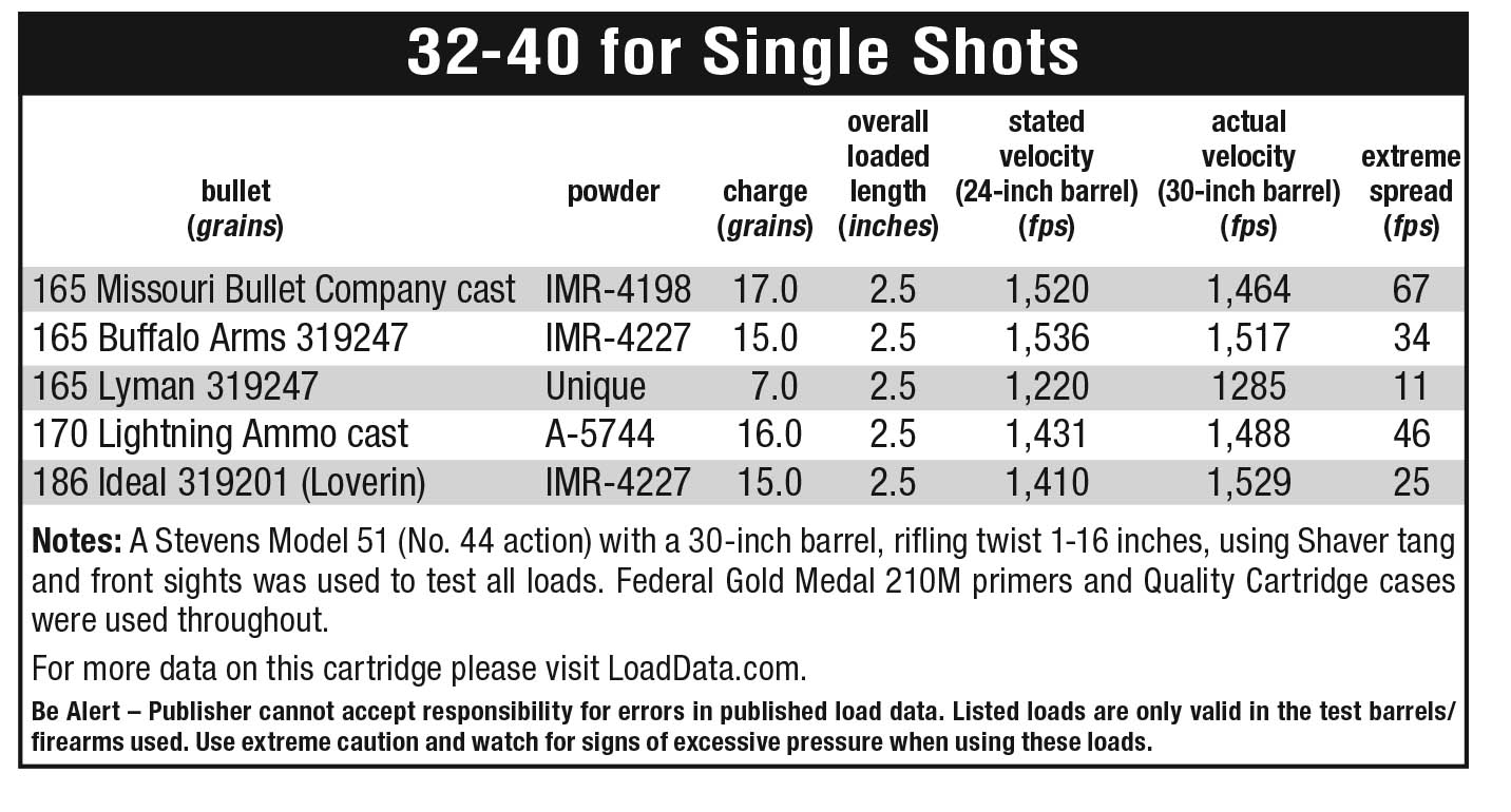 What does this say about the 32-40? Not only is it highly accurate, it’s also remarkably versatile within its limits, and admirably docile. Those characteristics will keep a cartridge around long after it’s been superseded ballistically by the latest hotshot. It is also a lot of fun to shoot, and can be loaded down to about 32-20 performance, or jacked up to (almost) 30-30. The cartridge’s sweet spot, however, is with a 165- to 185-grain cast bullet at around 1,500 feet per second (fps).