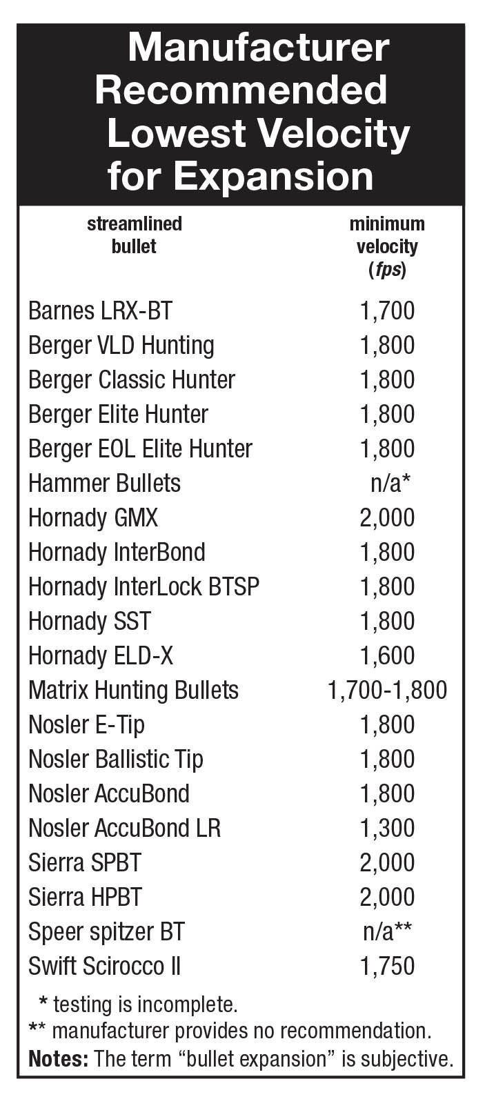 In my search for a bullet that performs well at distance, about 1,450 to 1,550 fps was targeted as a minimum velocity for expansion. Bullet manufacturers indicate that most bullets do not expand at a velocity this low, but I have found a few bullets that do expand somewhat. I used this low velocity because some of the .270 WSM loads approach this level at 1,000 yards. My thinking is that if bullets expand at the maximum intended distance, they will certainly expand at shorter ranges where impact velocity is higher, where hunting bullets are designed to perform.