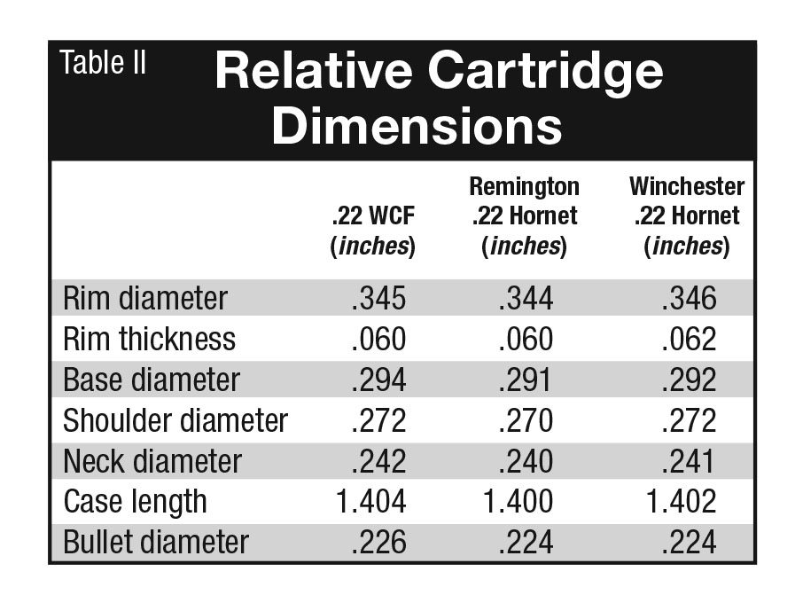 There has long been disagreement on differences between .22 WCF cases and early .22 Hornet cases, but I find no difference. While writing this column, I measured 1920s vintage .22 WCF cartridges and today’s .22 Hornet ammunition loaded by Remington and Winchester and have included my findings herein. There is a difference between .22 WCF cases and early .22 Hornet cases and today’s .22 Hornet case. The wall of the case was eventually made a bit thicker to increase strength, and the reduction in capacity is why some of the early .22 Hornet load data is excessive for today’s cases. A friend of mine who loves shooting his Winchester 1885 in .22 WCF loads Remington and Nosler .22 Hornet cases with 43-grain bullets cast with the old Lyman No. 225438 mould.