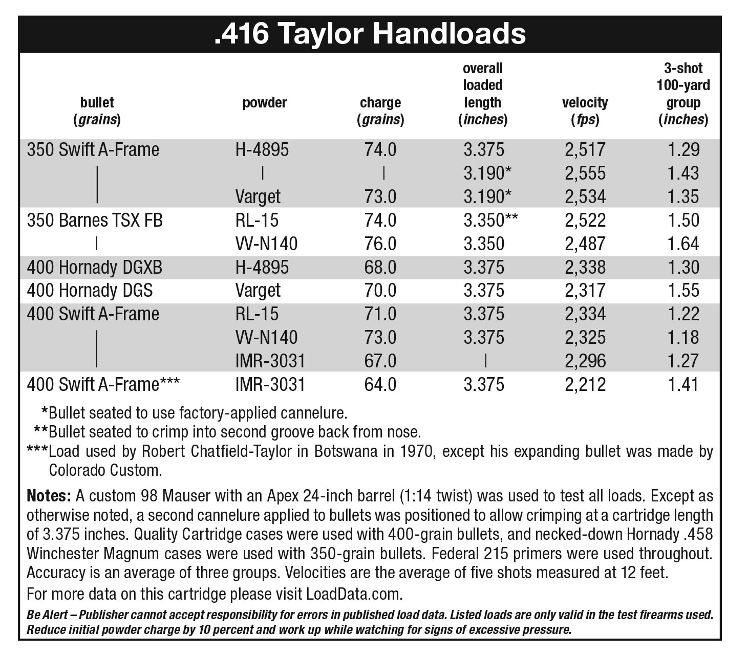 The .416 Taylor is an interesting cartridge, one I have hunted with just enough to become quite fond of a trim, little 9.5-pound Mauser chambered for it. Unfortunately, its creator did not live long enough to see how popular his cartridge would become. But as time moves forward, good ideas are sometimes replaced by better ideas, and if Chatfield-Taylor was still with us, he would surely agree when I say the only logical reason for chambering a rifle for his cartridge today is because its action is too short for the .416 Remington Magnum.