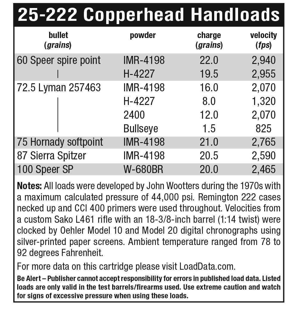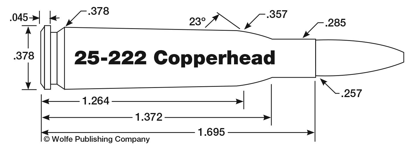 His criteria was a light and compact rifle chambered for a cartridge loaded with jacketed bullets weighing 60 to 100 grains with enough power to reliably anchor coyotes out to 200 yards. The cartridge would also have to be suitable for loading cast bullets to reduced velocities for bumping off raccoons and armadillos at close range. Choosing a rifle came easily. At the time, Sako had recently introduced the L461 Vixen action, scaled to fit the 222 Remington and 222 Remington Magnum cartridges. The 222 Remington case necked up for .257-inch bullets got the nod. Use of a Powley cardboard computer, along with guidance from RCBS founder Fred Huntington, resulted in a cartridge formed by necking up the 222 Remington case with no other change. John decided to call the venomous little critter the 25-222 Copperhead.