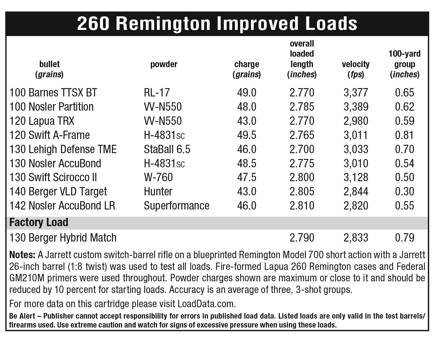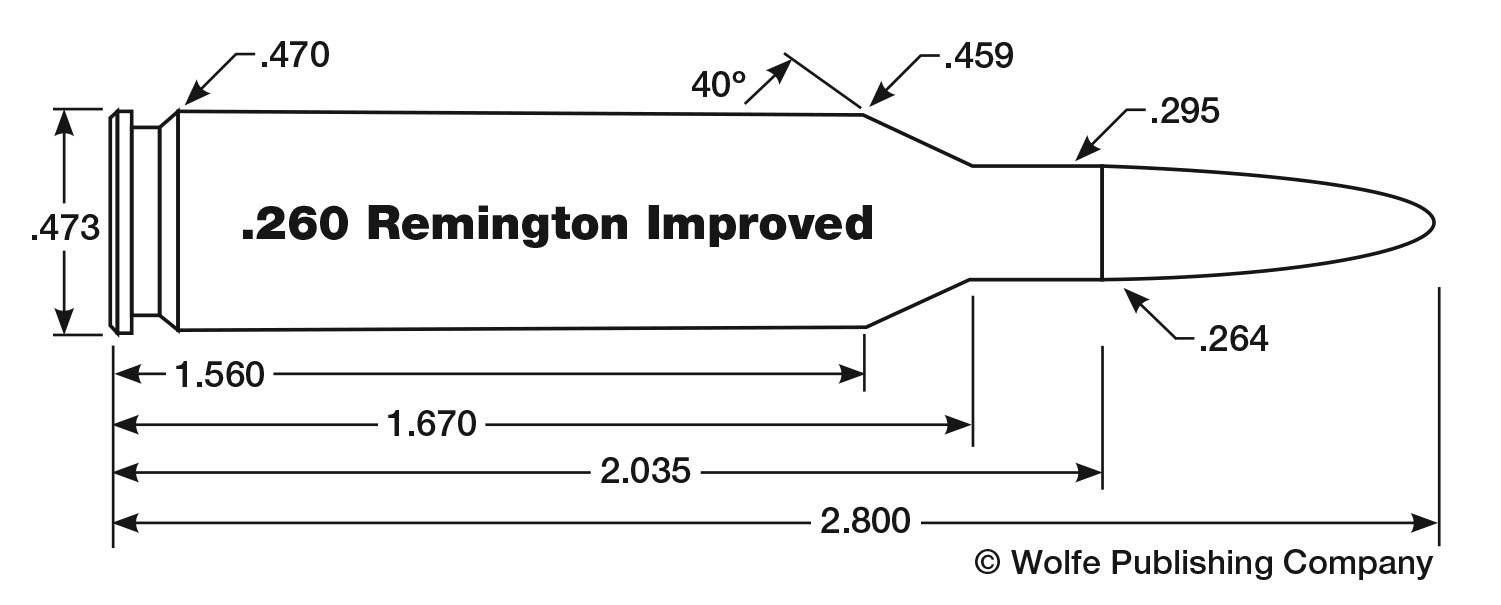 After fire forming Lapua 260 Remington cases in the chamber of my rifle, I found their average gross water capacity to be 54.8 grains. In comparison, Lapua 6.5 Creedmoor cases averaged 51.4 grains. Powders that are suitable for use in the 260 Remington work equally well in its improved offspring, and it will handle slightly heavier charges at the same chamber pressures for an increase in velocity. For the highest velocities possible, slow to medium-slow propellants such as Vihtavuori N550, W-760, H-4831sc and Superformance rank among the best choices. Due to the relatively small powder charges burned, a standard-force primer such as the Federal 210 usually does a good job of lighting the fire. I have not shot anything but paper with a rifle in 260 Improved, but many years ago, I hunted a great deal with a Remington Model Seven in 260 Remington, and the Nosler 100-grain Partition proved to be extremely effective on deer. When shooting black bears over bait, I switched to the Swift 120-grain A-Frame, and it was quite deadly as well.