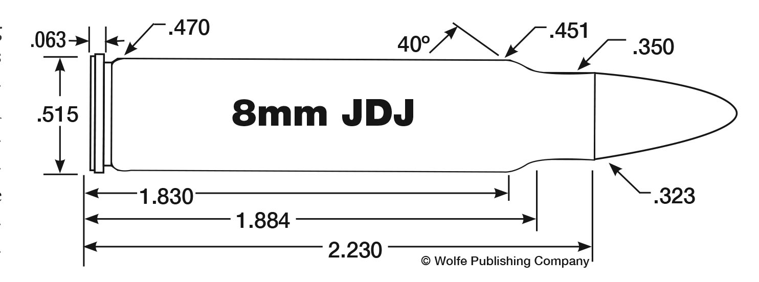 The cases are first necked down in my 375 JDJ full-length sizer, followed by a trip through the 8mm JDJ die. For fire-forming cases, 42.0 grains of IMR-4064 behind any 200-grain bullet works nicely. There is another way. Quality Cartridge makes 309 JDJ brass, and it is listed by Graf and Sons. An expander die from