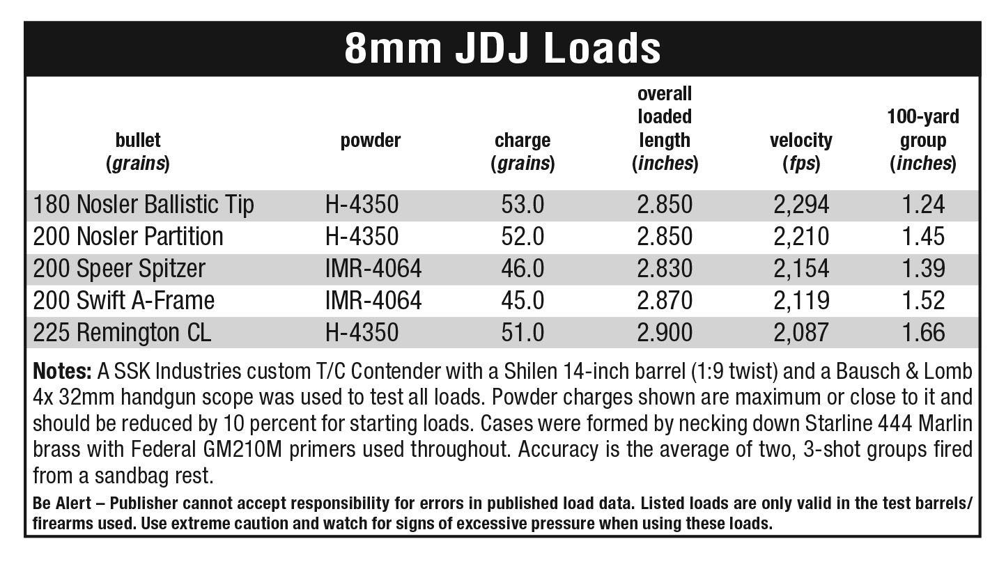 With that said, the 8mm JDJ has proven to be quite effective on big game, and the serious handgun hunter who finds an SSK Industries barrel chambered for it in a gun shop or possibly on eBay is lucky indeed. A supply of 444 Marlin cases is available from Starline, and while the 8mm JDJ reloading die set is no longer offered by RCBS or Hornady, you might get lucky with a web search there as well. A custom die set made by Redding is another option.
