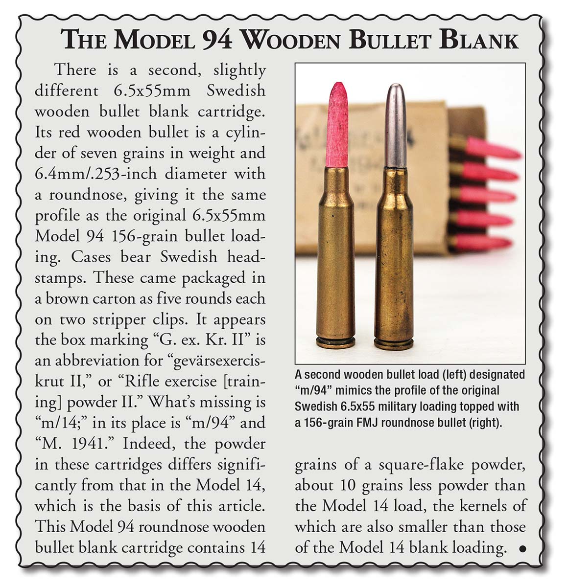A 23-grain charge of a flat, square-flake powder launches the wooden bullet. The Swedish military designated the Model 14 powder, “